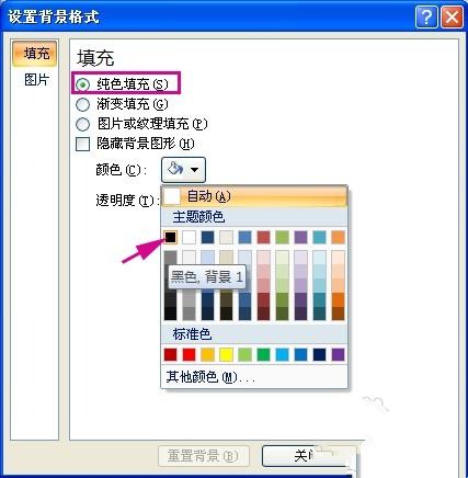 设置幻灯片的背景为黑色,ppt怎样设置背景呢?右击幻灯片空白处选项快捷菜单的“设置背景格式”,然后在“设置背景格式”窗口里面选择“填充”的“纯色填充”,在“颜色”里面设置选择“黑色”: