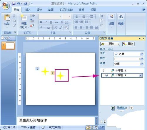 一个星星设置好了,我们点击这个星星,复制粘贴出相同的星星,并在“自定义动画”任务窗格中将“开始”选项修改为“之后”,然后利用“闪动”动画属性对话框中的“计时”选项将“延迟”选项设置为“1秒”。