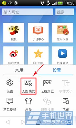 2)进入功能列表后,在设置界面点击“无图模式”按键。这样手机搜狗浏览器的无图模式就开启成功了!