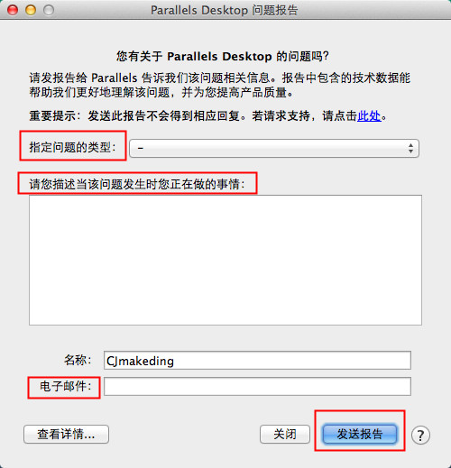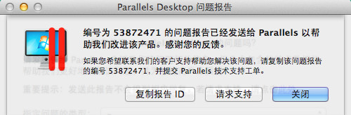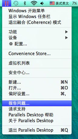 如果是透明(Crystal)模式 - 在菜单栏中 Parallels 图标上按下 Alt+Click 键并选择“报告问题...”。