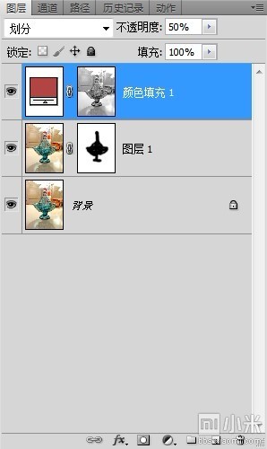 12、添加一个纯色图层,在下框输入# b24444,然后把图层蒙版删掉,隐藏这个纯色图层(图层左边有一个眼睛的东西,点掉就隐藏了),然后点击背景图层,进入通道面板,按ctrl+点击RGB图层选区高光区域,返回图层面板,显示之前隐藏的纯色图层并选择该图层,添加图层蒙版(在图层面板正下方的菜单里,类似照相机的标志就是了)。在把通道混合模式设为划分,不透明度设为50%(视具体情况而定)