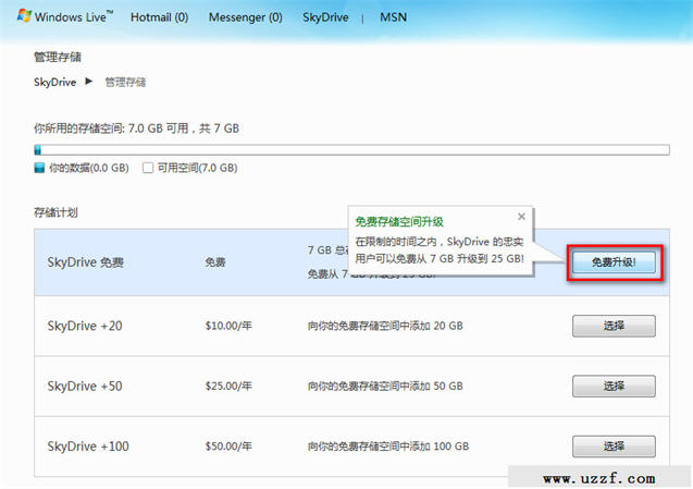 进入后,会看到免费升级的信息,为了不浪费那么大的空间,要是以后需要的话,就得花钱了哦。赶紧的点击先。