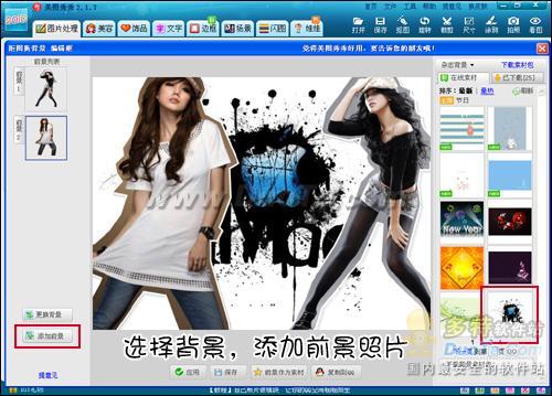 下面就可以进行图片叠加了。点击“完成抠图”后会自动进入“抠图换背景”编辑框,在这里可以选择软件自带的各种背景和个人电脑里面的图片作为叠加图片的背景。然后就是最后的步骤,点击“添加前景”按钮,就能把你想叠加的照片抠下后全部依次添加进来,这样就有一个很棒的图片叠加效果了,如下图4。两张照片顺利合并在一起,最终的画面也很有视觉效果,任务完成!!