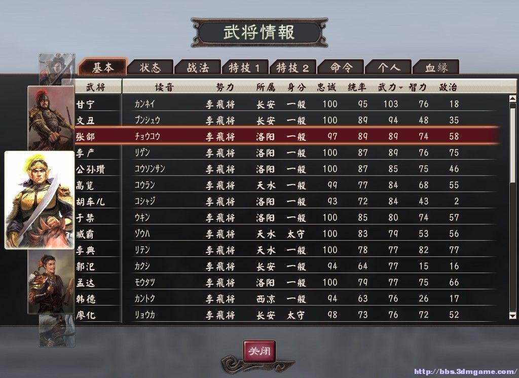 曹操那边让我劫走了李典朱灵和吕虔,其中李典和吕虔是直接下野被登用的。另一方面的两个弱小势力,张济的甘宁和文聘被我抢走,身边只剩下了他弟和他老婆,以至于邹氏孤零零守着上庸,被马家军一个绝道揍成我猪。。。期间很坑爹的是哥预备截留的宛城贾诩在登用四成几率的时候被老曹劫走了,然后又在许昌被离间到生活不能自理,老曹明智地把他调离许昌,哥鞭长莫及了。。。