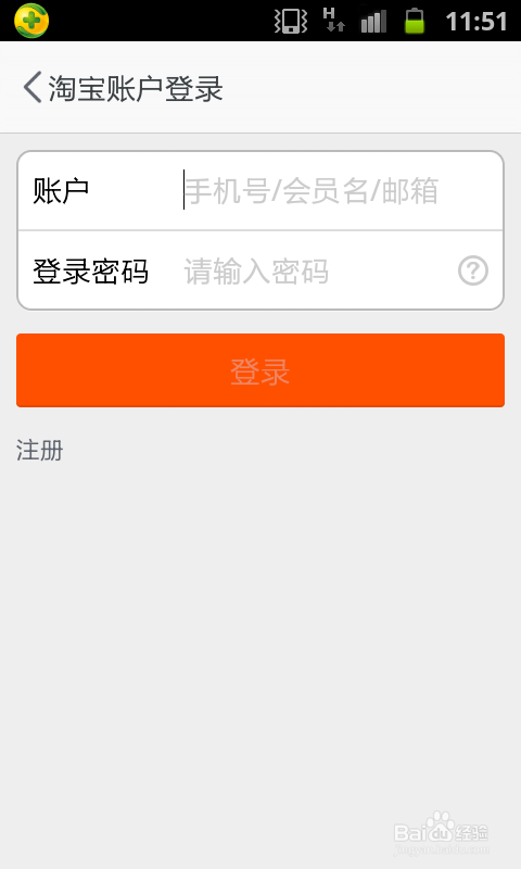 第三步、点击打开“我的淘宝”以后,需要先输入淘宝帐号和密码,点击下方的“注册”。