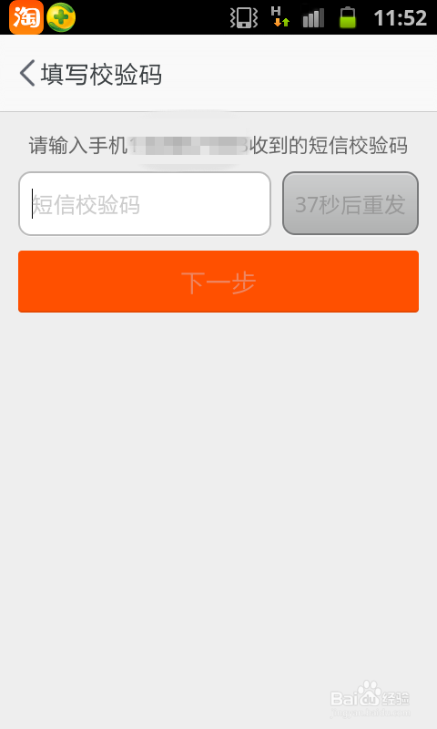 第五步、输入完成以后,需要在跳转的页面中输入手机收到的验证码信息。输入完成以后,点击“下一步”。