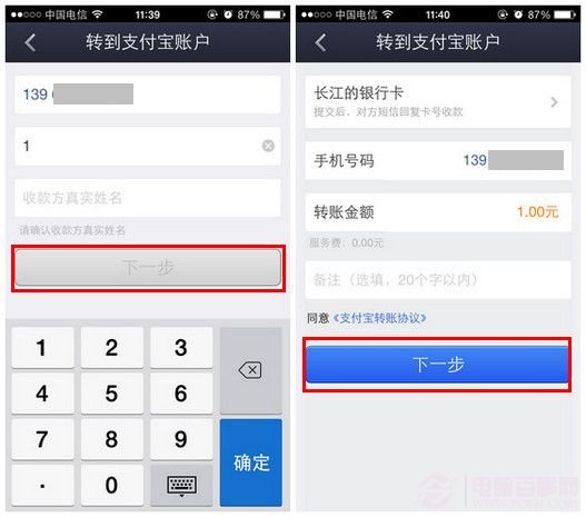 3、再次输入手机号码、转账金额、收款方真实姓名,点击【下一步】,确认信息无误,再点击【下一步】;