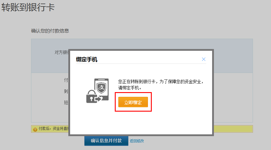 如果支付宝账户没有绑定手机,在此页面会提示您先绑定手机,绑定手机之后再操作转账到银行卡。