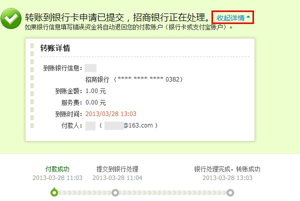 5)付款成功后页面提示申请已提交。可点击【收起详情】隐藏转账等信息。