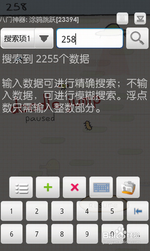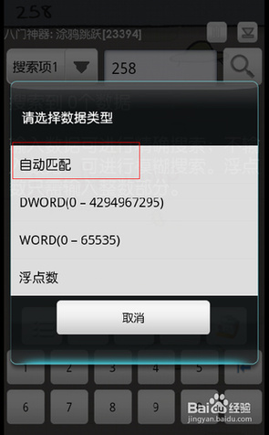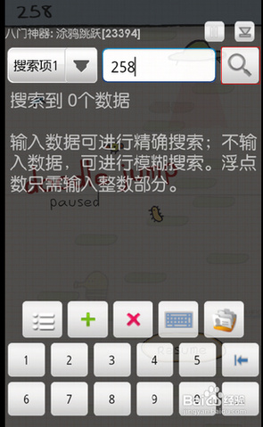 接下来,点击八门神器的键盘图标,在输入框输入你刚才玩的分数,我输入258,然后点击搜索,选择自动匹配。