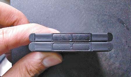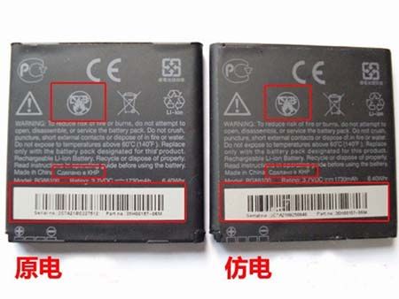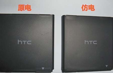HTC原电外皮摸起来都会有一种磨砂感,而假HTC电池则要显得光滑一些,仔细观察后就会发现,假电池的做工也有些粗糙,表面有细小的横纹。