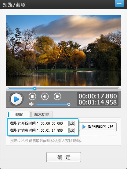 2、添加视频进入“预览/截取”对话框后,在该对话框截取视频片段。如果不需要截取视频片段,那我们可以直接点击“确定”按钮,将视频导入爱剪辑。