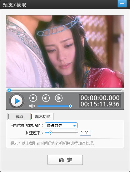 在导入视频时,或在“已添加片段”列表双击要对其调节速度的视频时,会弹出“预览/截取”对话框。在该对话框的视频预览框下方点击“魔术功能”选项卡,在“魔术功能”面板的“对视频施加的功能”下拉框中,选择“快进效果”,然后在其下面的“加速速率”滑杆处设置一个值即可,数值越大,则调节后视频速度越快。