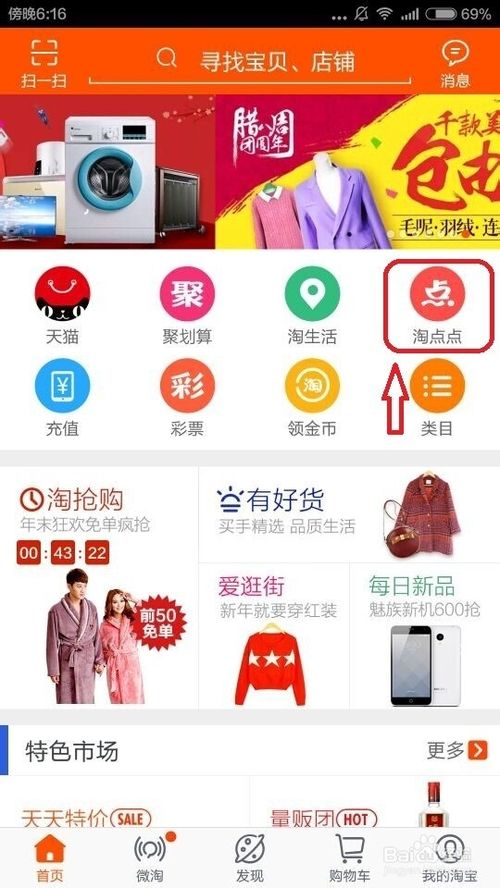 1、打开自己的手机淘宝客户端,找到“淘点点”,点击进入