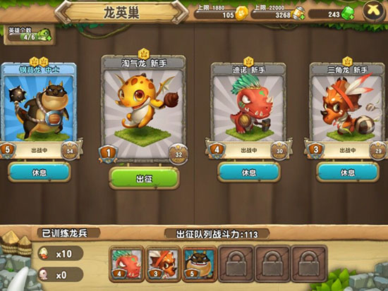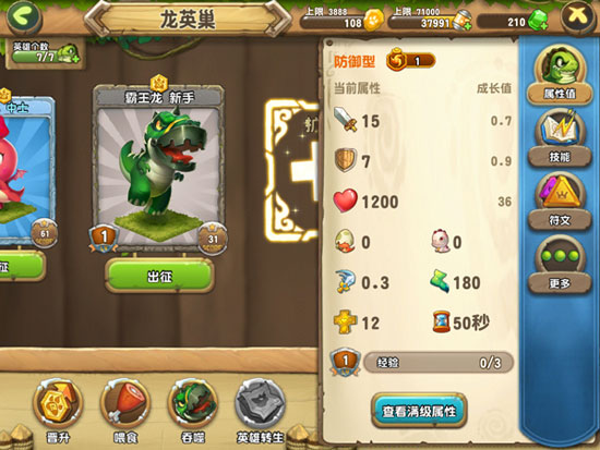 游戏中每一个英雄都携带技能,而技能则分为主动与被动两种,主动技能需要玩家手动释放,战斗的时候恐龙英雄头上会出现一个气泡,点一下就可以施放了。如果想获得第二、第三个技能,玩家还需要通过“荒野探险”活动来开启技能槽。当然每一个技能的施放都会有相应的冷却时间,所以对技能的合理操控往往决定了一场战斗的走向。