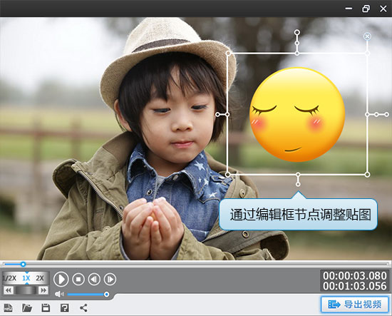 1、添加贴图回到主界面后,此时右上角视频预览框里,贴图已处于带方框的可编辑状态,我们可以通过可编辑方框,实现放大、缩小、旋转、变形、移动以及删除贴图。同时,我们还可通过“esc”键将贴图一键居中,通过上下左右方向键对贴图位置进行精确到1个像素的调整。