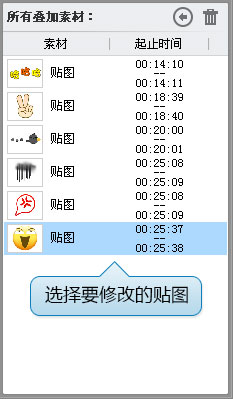 在“叠加素材”面板右下角“所有叠加素材”栏目,可以看到我们为整个影片叠加的所有素材。在列表中选中需要修改的贴图项,软件会自动定位到贴图修改处。在特效列表中,要修改的贴图应用的特效已打勾,我们可选择其他特效,或在“贴图设置”栏目进行修改,并在视频预览框中通过可编辑框对贴图修改调整。