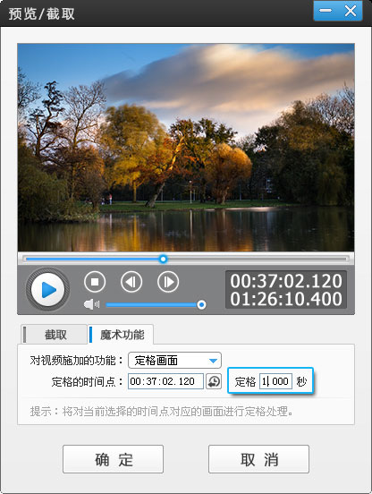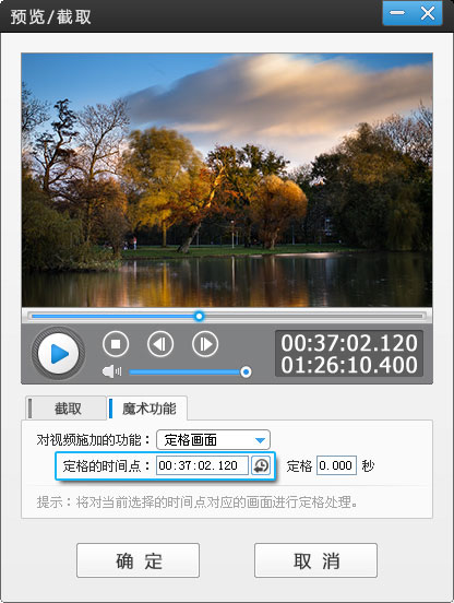 在导入视频时,以及在“已添加片段”列表双击已导入的视频时,我们都会看到“预览/截取”对话框。在该对话框的视频预览框下方点击“魔术功能”选项卡。在“魔术功能”面板的“对视频施加的功能”下拉框中,选择“定格画面”。