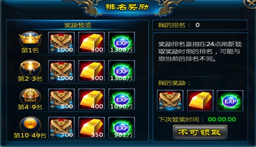 排行奖励:系统根据每天0点时玩家的排名发放奖励,玩家点击【排行奖励】中看到自己的排名以及领取奖励。