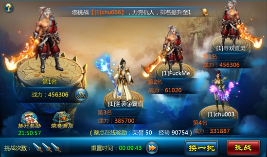 1.系统会随机显示四名玩家与他们的战力,若挑战成功,则名次上升。玩家还可以点击【换一批】按钮,随机刷新挑战对象。