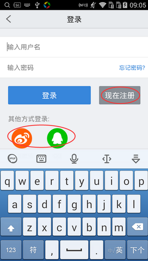 第四步,出现登入界面,点击下方的【现在注册】或【其他方式登入】,选择用qq和微博号——