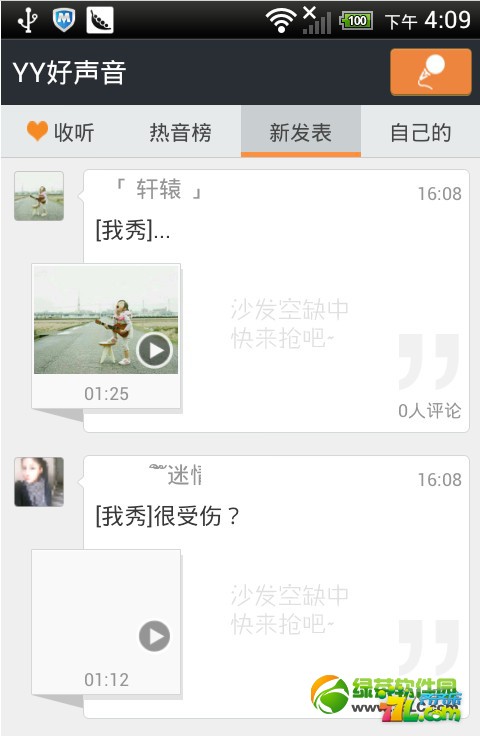 手机YY语音的“YY好声音”是整个软件的主体功能,共分为“收听”、“热音榜”、“新发表”、“自己的”四大类。“收听”即是收听自己好友发表的语音;“热音榜”会呈现一些热门的音频,以歌曲为主;“新发表”会呈现最新发布的音频作品;“自己的”就是自己发布的音频。