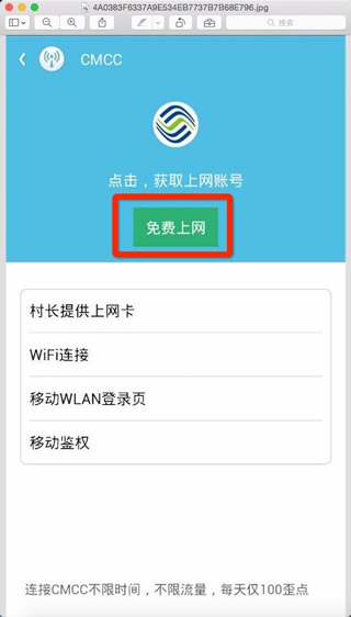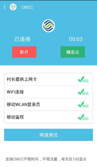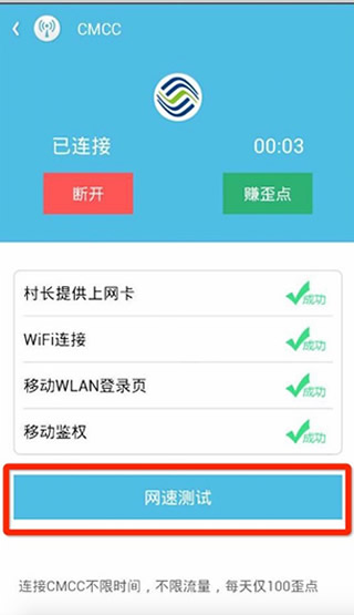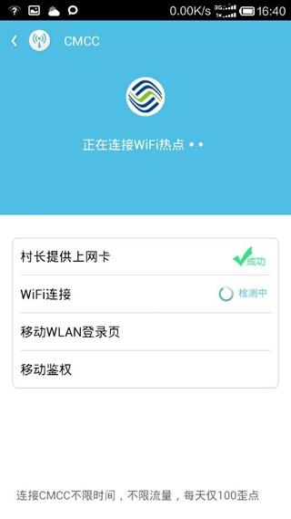三、以CMCC为例,点击CMCC热点,跳转页面后点击“免费上网”,软件将自动检查网络是否顺畅,并以10k-20k的数据流量作为辅助,获取上网账号。并自动进行“村长提供上网卡”→“WiFi连接”→“移动WLAN登录页” →“移动鉴权”四个步骤的连接。连接成功后会出现用户连接时长的计时显示,并有“您已成功连接”的温馨提示。