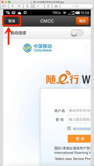 PS:连接过程中,第三步“移动WLAN登录页”若跳转出移动认证页面,请点击“取消”继续连接。