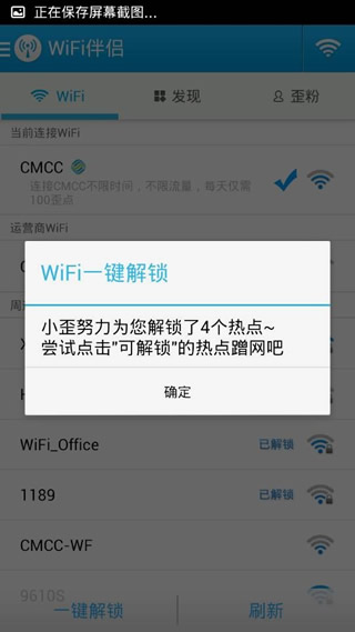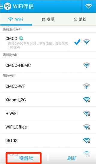 六、【一键解锁】:连接页面点击左下角的“一键解锁”即可尝试解锁周边WiFi,进行连接使用。