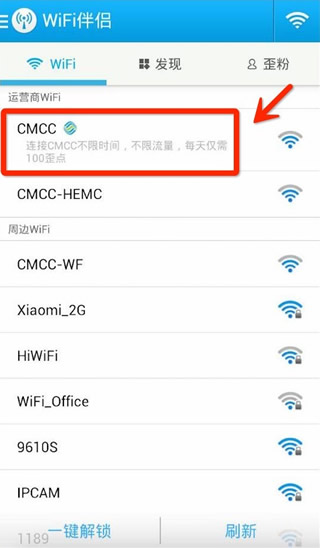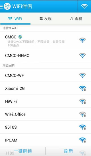 二、打开WiFi伴侣,在连接首页下拉操作,可刷新公共热点信息列表,搜寻热点信息并显示公共热点的信号强度