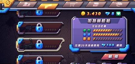 二十天后大家对关卡和玩法都非常熟悉了,第二十五天可以买激光,把人物升级上去,过不了的关卡就刷无尽,还有喜欢收集的玩家也可以购买之前的没买的武器,虽然没什么用,但看到那个锁在那很不爽有木有。