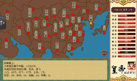 2、【建筑指南】,由于游戏仍未完善,所以特色建筑仍然不能建筑。所以,简要的说下各种普通建筑的用处。首先声明,可以通过收支表知道每个城市的 市集,治安,安定,运输,校场的满足属性为100,所以,初始的时候是10个城市,属性是1000,如果发现属性没满,就通过民生表去查看,然后利用 市集:加运输 义仓:加速人口发展 衙门:提高治安 寺庙:提高安定 校场:决定刚收来士兵的训练度 城墙:抵挡敌军攻城 民心低的处理方法有以下几种:建三次行宫,去紫宸宫点击左边的太监可以浩荡出巡,提高民心(降低赋税也能很小一部分的提高民心) 补充一下威望得到的途径:可以通过打胜战和天下大赦得到威望的提升。