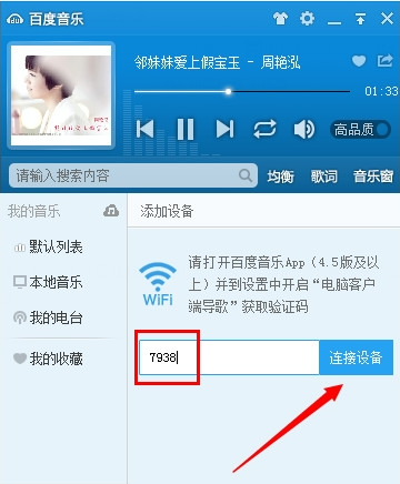 2、在确保电脑和手机设备处于同一WiFi环境下,然后根据该验证码,在电脑版百度音乐“验证输入框”中输入对应数字,点击“连接设备”按钮。