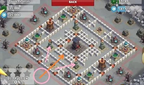 第二步,图中标示处7点钟方向放下差不多25个武士,吸引机关炮和火炮的攻击。