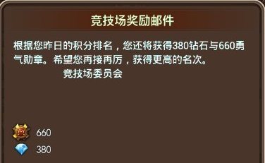 竞技场委员会为了激励大家积极打竞技场,会在每日根据你的竞技场排名,发放竞技场奖励,奖励中有大量的钻石和勇气勋章。其中,勇气勋章可以前往竞技场商店购买商店中的物品,是十分特殊的货币哦。