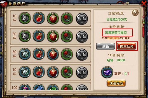 每周最多可完成200环任务,每周一0:00当前任务进度和可领取奖励会清空