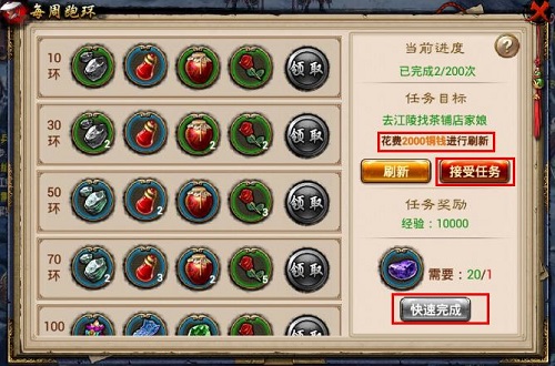 若对任务内容不满意,可花费2000铜钱/次刷新任务内容,直至满意,再接受任务