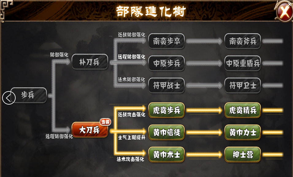 仔细看了军团相生相克之后你就会发现,步兵是种不被人克制、也不克制别人的部队,大家第一感观一定是步兵很废,但是我确不这么想,我认为程序大大没那么傻,作为一款平衡的佳作,是没有废物职业的。在看了下面的部队进化树后我更加相信这点。