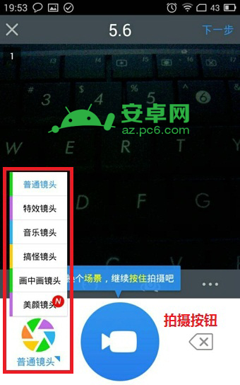 接下来进入到拍摄界面,我们来说说里面的功能。下方中间是【拍摄按钮】,左边那个是镜头选择,你可以选择不同的镜头拍出不同的效果。