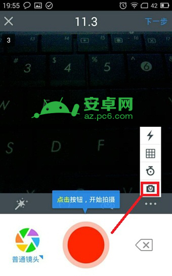 最右边的按钮分别是【闪光灯】、【表格】、【定时拍摄】和【拍摄方式转换】,其他的不用说,这个【拍摄方式转换】的话,就是你点击之后,中间的拍摄按钮会变成一个大红点,这时候你不需要再按住不松来拍摄,只需要点击一下就可以拍摄,再点击一下就停止拍摄。