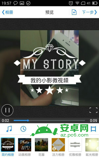 如果你拍摄完成了的话,可以点击右上角的【下一步】。进入到这里之后,你可以为你的视频添加各种效果,而上方有一个【保存到本地】的按钮。这个按钮呢,就是说你拍摄制作的视频不会发布到网络上去,只有在你自己手机的小影中能看到,而且只是二次编辑,就是说你下载点击这个视频,你还是回到这个界面,可以重新编辑。