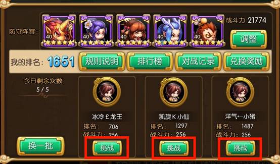画面中所显示的是你当前可攻击的玩家,一般可攻击的玩家都是排名比你靠前的,不能攻击比自己名次低的玩家。点击玩家头像可以看到该玩家的防御队伍,所谓知己知彼,百战不殆。了解了对方的阵容,在对战上选择大神就可以有针对性的选择了。