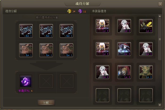 分解可获得蓝色魂侍,紫魂碎片*1,紫色魂侍,金魂碎片*1,金色魂侍,橙色碎片*1;每个界限突破额外增加1个碎片