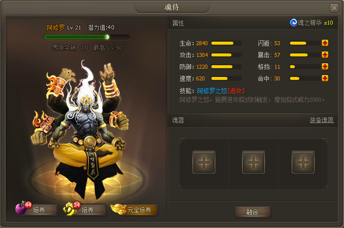 影界果实、金魂、元宝都可以增加魂侍的属性,培养出现暴击可获得魂之精华