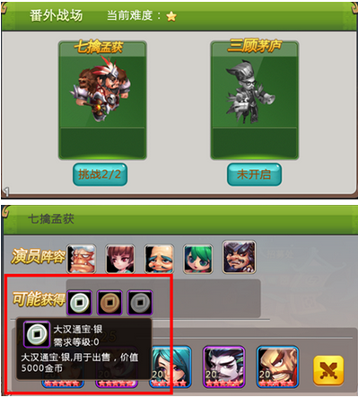 番外战场分为七擒孟获和三顾茅庐,七擒孟获BOSS为孟获,而三顾茅庐BOSS为叫兽版的诸葛亮。七擒孟获为每周一三五日开放,三顾茅庐则为二四六日开放。七擒孟获主要产出金币,而三顾茅庐则是主要产出经验道具。