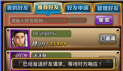 邀请后系统会弹出提示框,向对方发送好友请求,等对方同意后,好友即添加成功