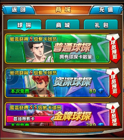 玩家可选择使用球探卡或者钻石聘请球探来招募球员,不同的球探招募的球员的能力也不同