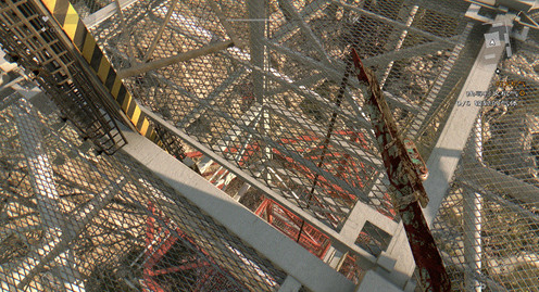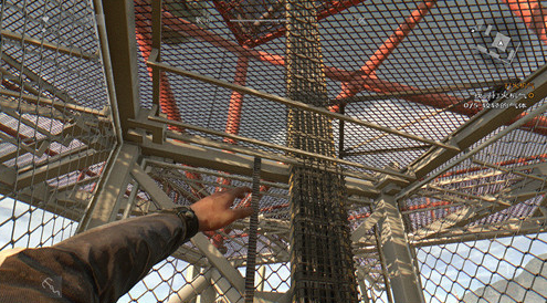 爬到电梯里面,进到里面之后往电线对面的铁网爬到最顶,到顶之后会有铁网挡住上不去,这时候bug就来了,视角往后移瞄准后方铁网边缘,空白键给他按下去,他就会穿过铁网爬上去了,这样就可以轻松上塔顶了。