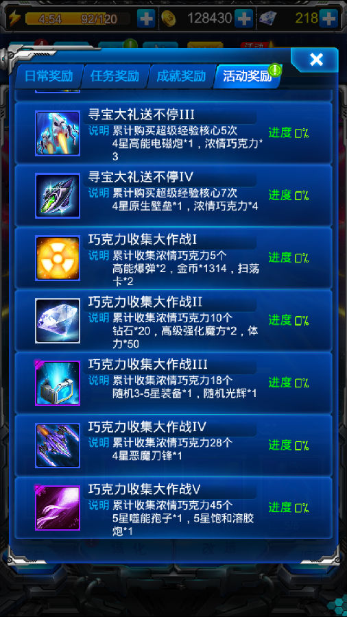 累计收集巧克力45个,奖励:5星噬能孢子*1,5星饱和溶胶炮*1