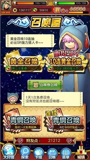 神秘少女洛特经营的召唤屋,可以消耗MH币,猎友P,召唤券等进行召唤,获得猎人卡。
